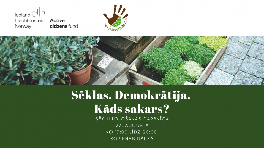 Darbnīca ar nosaukumu “Sēklas. Demokrātija. Kāds sakars?” brīvā formā sniegs ieskatu sēklu autortiesību jautājumos, likumos par sēklu selekcionēšanu un citiem ar sēklām saistītajiem aspektiem. Būs arī praktiska darbošanās – atkarībā no laikapstākļiem notiks Kopienas dārza sēklu ievākšana, iepazīšana, kā arī sēklu maiņa. Tāpēc tie, kas vēlas dalīties un mainīties ar savu augu sēklām, kā arī par tām pastāstīt nedaudz vairāk, aicināti sēklas ņemt līdzi.